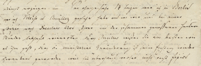 Zu meiner Verwunderung habe ich Kleist hier in B[erlin] getroffen, nach einem Verschwinden von mehreren Wochen, das niemand hier zu enträthseln weiß, und dessen Ursach er jedem verschweigt ist er wieder erschienen, gesünder und besser humorisirt als je. Wie er mir sagt so will er sich ebenfalls um eine Anstellung bewerben die den doppelten Zweck erfülle seinen Unterhalt zu sichern und seiner Muse Spielraum zu gestatten. Er arbeitet jetzt an einem brandenburgischen Stoff.